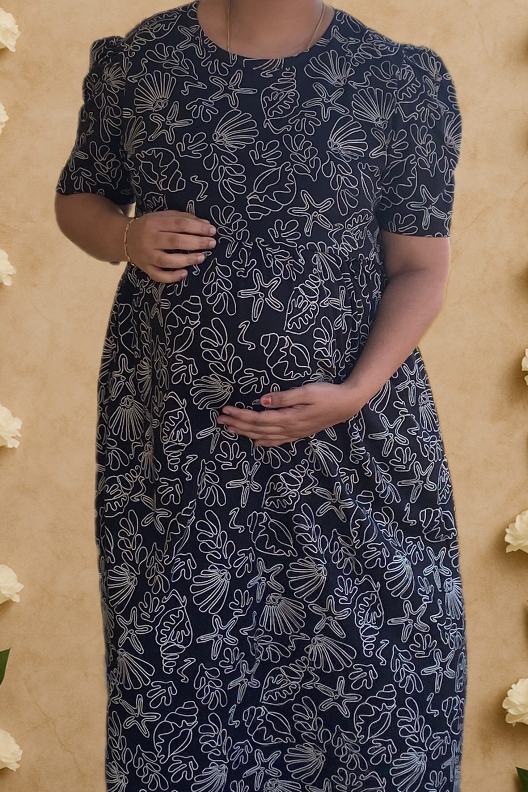 Black With Leaf & Floral Motif Pattern maternity maxi full length-51inches