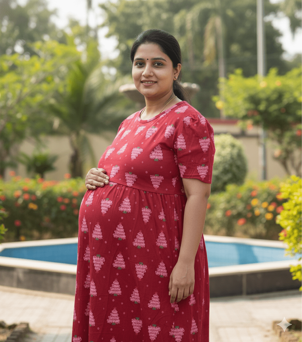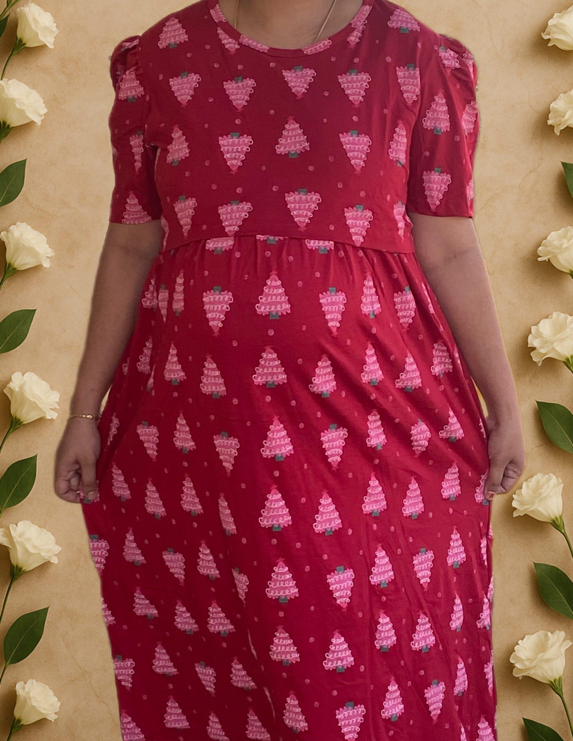 Be the first to review “Dark Red With Pink Christmas Tree Pattern maternity maxi full length-51inches”