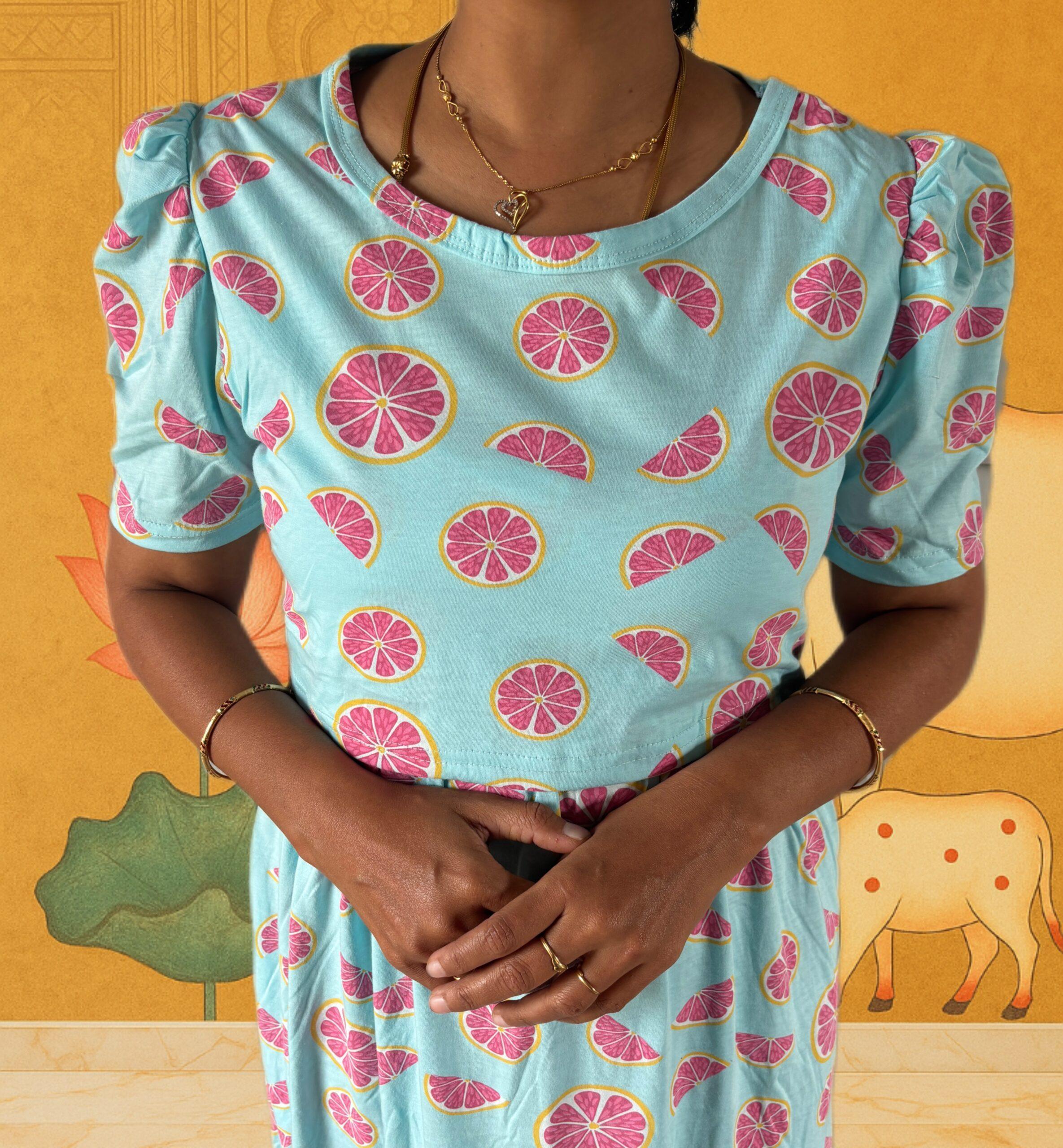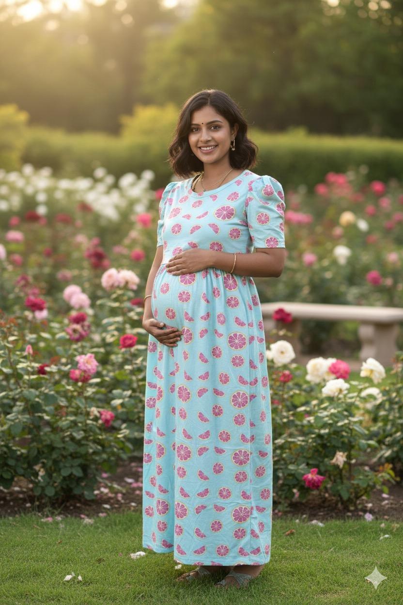 Be the first to review “Light Blue with fruit pattern maternity maxi full length-50inches”